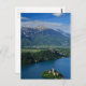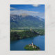 View across Lake Bled to the island church and clifftop castle from Mala Osojnica, Slovenia.