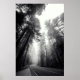 This black and white photo features a low angle view of Sequoia Trees in a forest in California.
