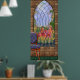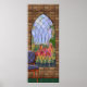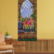 Almost life-sized (60"x24"), this poster features an original painting by Leslie Sigal Javorek of an elegant cherry wood chair upholstered w/a William Morris fabric, partially overlapping an arched, leaded window set in a brick interior Chapel wall revealing the view of a lush, colorful garden. Rich in details, this poster is a great choice for a room with few (or no) windows.