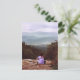 This postcard features photography of one of the wonderful hikes in the White Mountains of New Hampshire. A hiker has followed the Nancy Pond Trail all the way to the Norcross Pond outlet which affords spectacular views of the Pemigewasset Wilderness, Mt. Bond, the Twin Range and the Franconia Mountain Range. He has laid his hiking stick on the rocks and is resting on a large granite slab. He is wearing a red bandana and a lilac purple shirt which says: Support Jazz. The vista is magnificent with sky and mountains in a color range of blue, green and mauve.