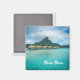 Souvenir fridge magnet of a luxury overwater thatched roof bungalow resort in the clear blue lagoon with a view on the tropical island of Bora Bora, near Tahiti, in French Polynesia.