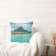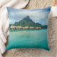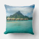 Throw pillow of a luxury overwater thatched roof bungalow resort in a vacation resort in the clear blue lagoon with a view on the tropical island of Bora Bora, near Tahiti, in French Polynesia.