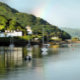 After a day of rain, the sun finally comes out and a rainbow appears in the sky, in this beautiful landscape from Aberdyfi harbour in Wales, with boats in the water and some of the village houses.