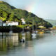 After a day of rain, the sun finally comes out and a rainbow appears in the sky, in this beautiful landscape from Aberdyfi harbour in Wales, with boats in the water and some of the village houses.