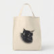 The printing came out very well, better than I had anticipated. The natural color fabric is sturdy with strong seams and comfortable handles. This tote fits easily over my shoulder. As it is filled, the bottom flattens out--very cool! I would buy this product again. This grocery tote holds a lot of groceries! The image quality was very good. The colors were a little darker than I had expected. The darkness may have been due to printing on a natural color fabric rather than on white. The cat design is attractively centered on the tote. The spirit of the design is very lively, just as it appears on the Zazzle website.