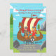 Celebrate your little Viking boy or girl birthday with this colorful invitation! It features a boy and a girl Viking with a horned helmet inside a Viking ship. In the back, there's a Scandinavian landscape and a Viking thatched roof house decorated with a skull and dragon heads. In the front, there's a sign that reads PARTY, the boy's wolf pet, and yellow balloons. It's ideal for a Viking-themed birthday party, both for boys or girls.This Birthday Party invitation is easily customized for your event by adding your details.
