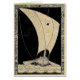 Wooden Viking longship powered by wind in the sails and oars lowered into the water, sailing on the open ocean in a star-filled night sky. The decoration on the sail is matched by the elaborate border around the picture.