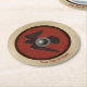 A 3d rendering of a Viking shield superimposed on an old paper or parchment background image. The shield is decorated with a black raven (Corvus corax) painted on red leather. Add your own text.