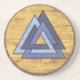 A nifty drink coaster featuring the classic Valknut design over beautifully weathered wooden Viking shield background.