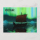 A slightly stylized image of a Viking longship sailing at night under the Northern Lights there a couple of icebergs; most of the crew is asleep. Text reading "VIKINGAR" (Vikings) also appears.