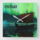 A slightly stylized image of a Viking longship sailing at night under the Northern Lights there a couple of icebergs; most of the crew is asleep. Text reading "VIKINGAR" (Vikings) also appears.