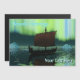 A slightly stylized image of a Viking longship sailing at night under the Northern Lights there a couple of icebergs; most of the crew is asleep. Text reading, "Season's Greetings" appears in glowing blue and white. Add your own additional text.