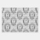 Wrapping paper in three different wine-themed styles including a French lady, wine glasses and decanters, and old fashioned French handwriting.