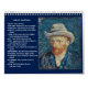 This calendar displays 14 paintings by the great Dutch artist Vincent van Gogh produced between 1886 and 1890. It lists the paintings and the date produced on the back cover for easy reference. It's a perfect gift for any art lover. Before purchasing, please be sure to personalize the date, and scroll to select all your preferred options (e.g., Holidays, Size, Binding color, etc.).