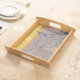 This is a well made, sturdy wooden tray with a flawless black finish and lovely map on the tray surface. It is both vintage & modern at the same time. Looks exactly like the photo; does not disappoint. So nice to find something of quality individually made and not the mass-produced 'shabby chic' merchandise seen in stores. I am so pleased to be able to give this to my college-age niece for her birthday. This can be used as a tray to hold jewelry or toiletries, or hung on the wall as art. The map surface is sealed (it is slightly shiny) so would be moisture resistant. It is well worth the asking price but I was able to apply a sale code as well. Very happy with my purchase. Map is crisp & clear and sealed with a water-resitant finish.