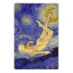 The blue night sky is filled with swirling clouds, stars, and a bright crescent moon.