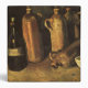 Still Life with Four Stone Bottles, Flask and White Cup (1884) by Vincent van Gogh is a vintage Post Impressionism fine art painting. A row of wine bottles and water jugs on a shelf or table.