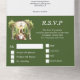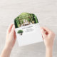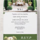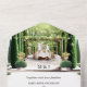 A beautiful all-in-one woodland watercolor invitation featuring faux sparkling string lights in front of beautiful manicured poplar trees and topiary bushes. A wooden table dressed with a crisp white table cloth has wooden chairs on either side of it and a wooden arch above it filled with vine leaves and grapes. The table is set on top of large paving blocks and the scenic setting has an upmarket and sophisticated look to it. The generative content graphics are set against white and forest green backgrounds that have black and white editable templates on them. The bottom third has a tear off response card with personalized rsvp address for your guests to complete. These are ideal for Italian winery, Tuscan vineyard; Nappa Valley wine farm and al fresco country woodland weddings or dinner parties.