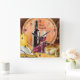 A bottle of red, grapes and bread with a wine barrel background decorate this clock which can be personalized with any company name, names or saying!