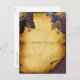 Elegant save the date post card with a winery, vineyard wedding theme. Old torn, aged, folded paper on burgundy background with images of grapes and grape vines.