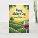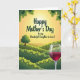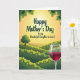Designed with a sunlit landscape and a cozy celebratory touch, this card centers on a message that reads “Happy Mother’s Day to my Wonderful Daughter-in-Law!” in dark lettering near the upper middle. Broad green leaves curl in from the top corners, like a gentle frame that draws your eyes inward and sets a calm, affectionate tone ❤️. Behind the text, the sky fades from bright yellow at the top into a softer golden orange nearer the horizon, suggesting a peaceful morning or evening glow. Across the middle, rolling hills are covered in neat rows of light-green plants, creating the look of a well-tended vineyard where care and closeness feel quietly present. A single sturdy tree stands on a distant rise, its brown trunk and rounded green canopy adding a steady, protective presence. In the lower right foreground, a clear stemmed glass holds a deep ruby-red drink that feels like a shared toast between family members 🌼. The glass catches light along its rim and bowl, with the rich red liquid contrasting against the soft greens and warm sky.