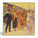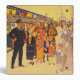 Vintage advertising poster for London Underground subway transportation, showing passengers on a subway platform; one side has people with dress contemporary to the poster and the other side has people from the time of the subway opening in 1890. circa 1924