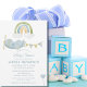 Celebrate your little one on the way with this cute, customizable baby shower invitation! This watercolor design features a fun vintage airplane in soft baby blue and yellow colors pulling along a party banner that spells out "boy!". A beautiful rainbow of green, blue and yellow arches soar above white puffy clouds.