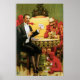 In this 1915 advertising poster Alexander Fredrik is seen sitting at a table decorated with skulls playing cards with the devil. On the floor sit a group of little demons playing a game as well.