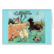 Vintage artwork depicting a cat on a brick wall playing a fiddle while a cow, chickens and pigs dance in the light of a crescent moon. Another cat sits by watching the dancers. The card is blank inside for your own message.