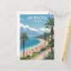 Capture the sunny charm of the Turkish Riviera with this vintage-style travel poster postcard. This stunning illustration showcases Antalya, Turkiye, featuring a beautiful sandy beach, turquoise Mediterranean Sea, lush palm trees, and the dramatic backdrop of coastal mountains. The design has a classic retro tourism feel, perfect for sending to a friend, adding to a travel-themed collection, or framing as a piece of exotic, wanderlust-inspired wall art. Ideal for lovers of beaches, summer vacations, the Mediterranean, and retro poster art.