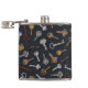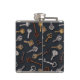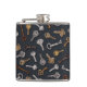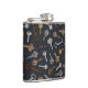 This flask features hand-illustrated vintage and antique keys for safes and locks on a dark blue background.