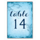Vintage aqua blue scroll leaf wedding table number card, featuring elegant floral leaf scrolls in blue on aqua and turquoise grunge background. This elegant template design with vintage elements is part of a wedding collection or set and is fully customizable. Great for a summer wedding. Also great for other occasions such as engagements, birthdays, anniversaries, bridal shower, reception.