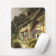 Vintage illustration architectural image featuring a classic English country cottage house with a thatched roof and lovely English gardens and a woman standing by the front steps. Could be a beautiful country bed and breakfast inn.