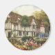 Vintage illustration architectural image featuring a classic English country cottage or estate with a thatched roof and lovely English formal gardens with flowers in bloom in the spring. Could be a beautiful country bed and breakfast inn.