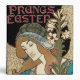 Vintage illustration Art Nouveau advertising poster design featuring Prang's Easter Publications by Louis John Rhead, 1895. Prang's Easter holiday Publications cover art features a beautiful Victorian woman with a bohemian style. She has long flowing blond hair and is holding an Easter lily flower.