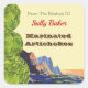 Based on vintage crate art, an editable recipe sticker with retro artichokes floating to one side of a choppy ocean, reading "From the Kitchen Of" in green block letters, room for our name in red script and brown bold letters for your recipe name.