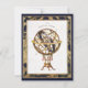 Vintage illustration astronomy and antique celestial image featuring spheres that depict parts of the Earth including the North and South poles, Tropics of Cancer/Capricorn and the equator. Framed in a beautiful gold and blue decorative border. An armillary sphere is an early astronomical device for representing the great circles of the heavens, including in the most elaborate instruments the horizon, meridian, Equator, tropics, polar circles, and an ecliptic hoop.