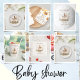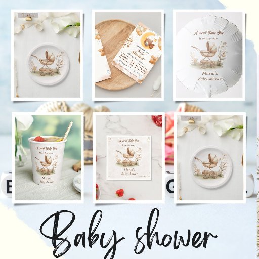 This elegant paper napkin features a delicate, watercolor-style design perfect for a baby shower celebration. The illustration showcases a vintage-style baby carriage in soft sepia tones, surrounded by gentle floral and grass elements in muted brown and green hues. The text reads "A sweet Baby Boy Is on the way" at the top, followed by "Maria's Baby shower" and includes the date "20-06-2025". The overall color palette maintains a sophisticated, neutral aesthetic with warm brown tones on a cream background.