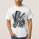 A traditional Sailor Jerry-style flash tattoo featuring a comb and shears as the central elements. The bold black-and-white design is adorned with classic floral accents and a flowing ribbon, exuding timeless barber culture. The minimal shading and clean lines make it a perfect choice for t-shirt designs, set against a light background to enhance its vintage charm.