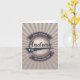 Baseball Greeting Card features a vintage style baseball illustration, customized with name, underlined by a swash. This design include elements of blue, red, a baseball, banners and a starburst background. Template for personal customization, including age or player number and date.