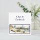 A custom invitation with a vintage illustration from a storybook of a child laying on the sand at the beach. His dog swims far out in the waves.