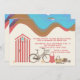 A summer-theme invitation complete with a changing cabana, bicycle, one piece bathing suit, and other personal items.