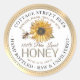 Central design features a vintage sunflower illustration and watercolor honeybee on white background. Gold gradient border. Personalize with your apiary name, address and honey description (raw, hand bottled, single source etc.). Also include your honey net weight. Common honey net weight conversions: 8oz (227g), 12oz (340g), 16oz (454g), 32oz (907g), 5lb (2.27kg).