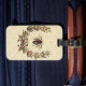 Luggage tag features vinted vintage bee and wreath illustration on patterned background.