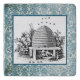 Vintage beehive illustration with blue border on distressed antique blue damask patterned background