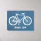 An indigo blue vintage bike with a custom quote. A personalized poster with the words, "ride on."