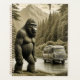 Vintage colors Sasquatch or Bigfoot walking out the woods to run into a retro RV.