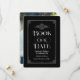 Announce your wedding with this stunning save the date designed to look like a vintage book cover. The dramatic black background features an ornate decorative border with elegant corner details framing the bold "Book Our Date" typography with flourished calligraphy accents. The couple's names, date, and location are presented in refined white text, with the back featuring a full engagement photo. A perfect choice for book lovers and literary-themed weddings. All text and photo are fully editable.
