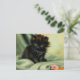 Postcard featuring a lovable black kitten! The green eyed kitten sits on a blanket with a pink flower. A beautiful gift for cat lovers and Victorian art enthusiasts!