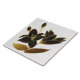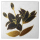Beautiful decorative ceramic tile featuring an illustration of vintage black dark gold lily flowers on a white marble textured background.